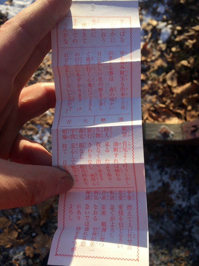 お賽銭を放り投げてお祈り、せっかくだからおみくじもね。